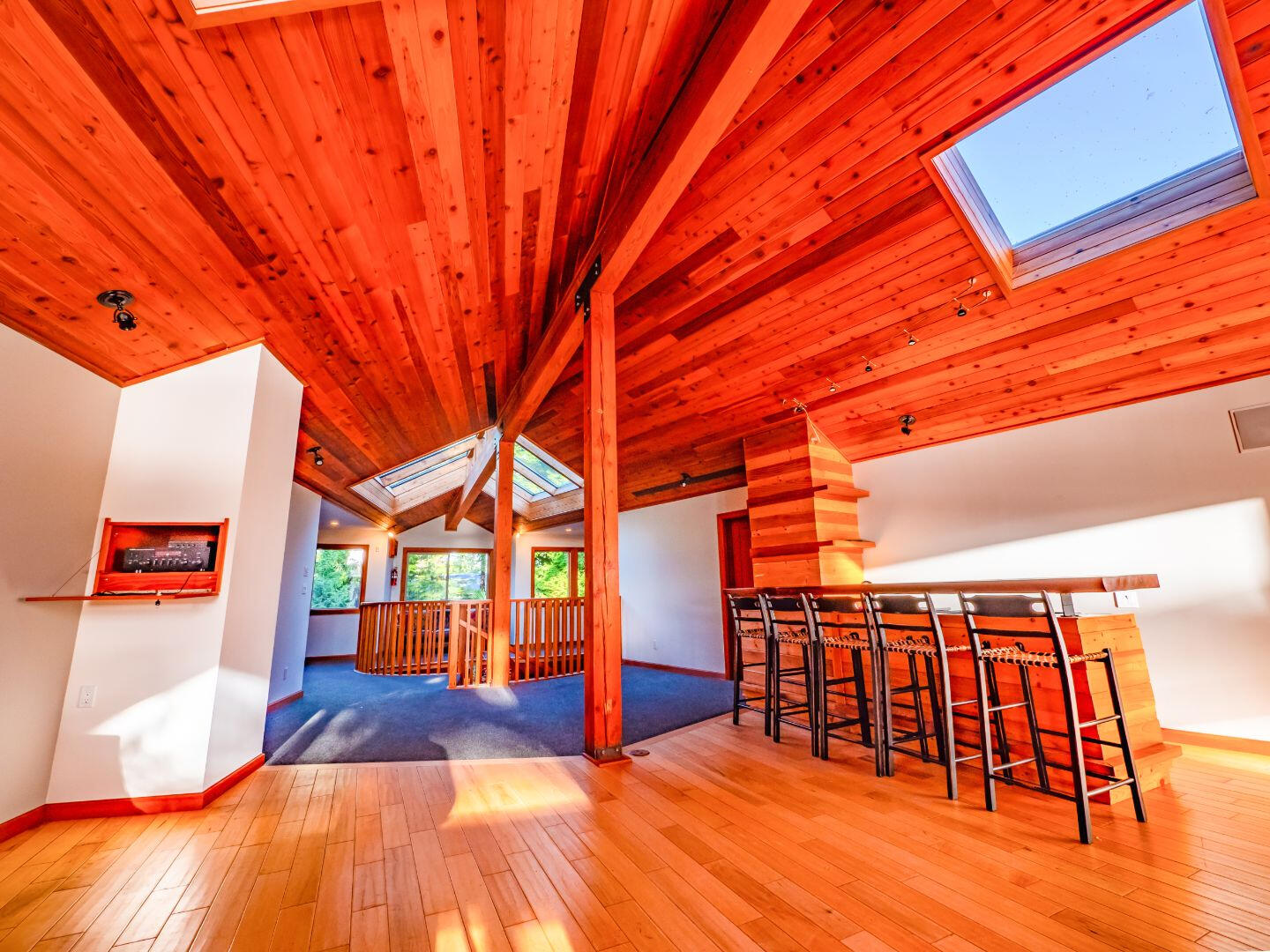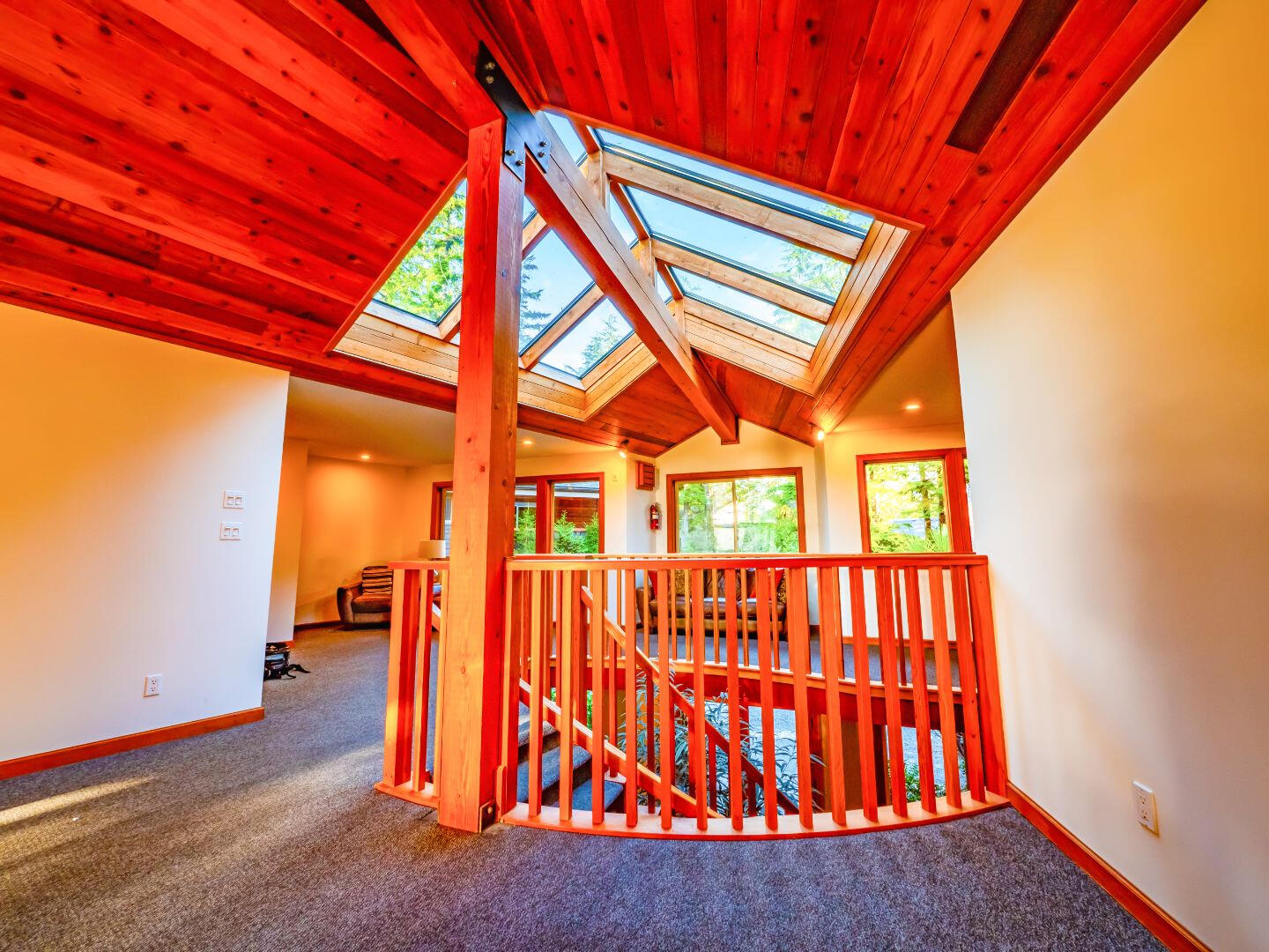 Immerse yourself in the serene ambiance of the cabin's main floor, where the essence of West Coast architecture harmoniously merges with the surrounding beauty of nature. Three magnificent skylights flood the space with natural light, serving as ever-changing frames for the surrounding rainforest's captivating scenes. The vaulted ceilings add a spacious feel, complementing the large dining area that can accommodate up to six guests, perfect for communal dining or intimate gatherings. The living area is a testament to rich, inviting design, with a large stone fireplace taking center stage, exuding warmth and character. As you step outside onto the deck, be prepared to be awestruck by the breathtaking cliffside view of Terrace Beach, as the sea's rhythmic symphony adds to the unrivalled tranquility of the space. This cabin's main floor encapsulates the essence of a nature-inspired retreat, offering a sense of serenity and connection to the picturesque environment that surrounds it.